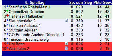 In einem nervenaufreibenden Match gelang den Hallunken schließlich ein 6:2-Sieg gegen die Steinfüchse. Da Chemnitz tatsächlich gegen die Berliner vom Schlachtensee verlor, lagen mit gleichen Siegpunkten wie die Konkurrenz die Hallunken nur hauchdünn mit einer Brettpunktdifferenz von 47 zu 46 auf Platz 1.