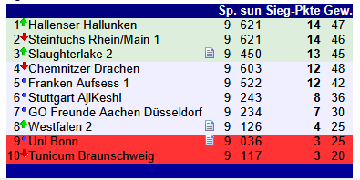 Die Hallenser Hallunken trafen dabei auf die bis dahin souverän führenden Steinfüchse Rhein/Main, während gleichzeitig die Chemnitzer Drachen und Slaughterlake gegeneinander antraten. Hier mussten die Hallunken auf Schützenhilfe aus Berlin hoffen, da die Chemnitzer Drachen im Falle eines Sieges aufgrund ihrer 48(!) Brettpunkte uneinholbar vor den Hallunken lagen.