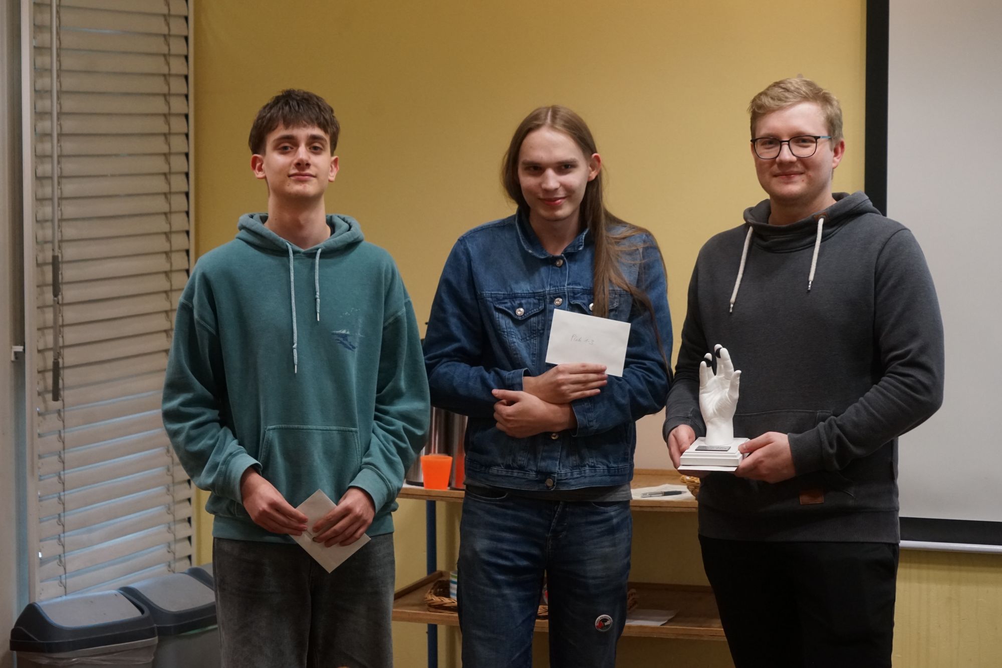 Kevin Sanow (4d) sicherte sich den formalen Turniersieg, gefolgt von Aved Pittner (6d) auf dem zweiten Platz und Adam Dottan (4d) auf Platz drei. Da sich aber alle drei im Kreis schlugen - zuerst gewann Kevin überraschend gegen Arved, verlor dann aber gegen Adam, der danach wiederum gegen Arved verlor - und im Übrigen unbesiegt blieben, wurde von allen ein gemeinsamer erster Platz akzeptiert. Das Anrecht auf den wunderschönen Doppel-Zack-Pokal gab Kevin jedoch verdächtig bereitwillig an Adam ab.